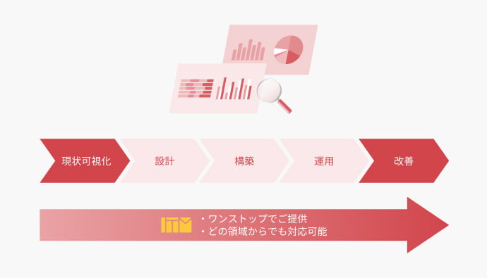 ITシステム全体におけるプラットフォーム構成の最適化、セキュリティ対策の有効性などを可視化し、問題があれば改善に向けた対策をサポートします。